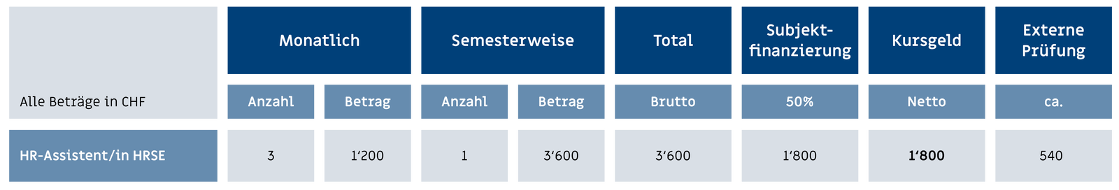 Der Bund unterstützt Studierende bei ihrer Vorbereitung auf eidgenössische Berufsprüfungen (eidg. Fachausweis) und höhere Fachprüfungen (eidg. Diplom) mit finanziellen Beiträgen im Rahmen der Subjektfinanzierung mit 50% der Unterrichtskosten, Lehrmittel und Materialien. Diese Subvention wird nach Absolvierung der eidgenössischen Prüfung, unabhängig vom Prüfungsresultat, auf Antrag des Studierenden vom Bund ausgerichtet. Falls Sie die eidgenössische Berufsprüfung «HR-Fachleute» nachfolgend absolvieren, erhalten Sie auch einen Bundesbeitrag von 50% auf den Preis des Bildungsgangs «HR-Assistent:in HRSE».